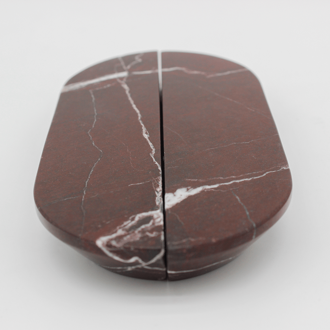 Expertly carved from solid Rosso Levanto, this pull pairs a sleek, minimalist profile with the drama of deep burgundy tones and striking white veining. The refined silhouette makes it ideal for drawers and cabinetry, while the stone’s natural movement creates a luxurious, statement-worthy focal point in kitchens, bathrooms, or wardrobes.