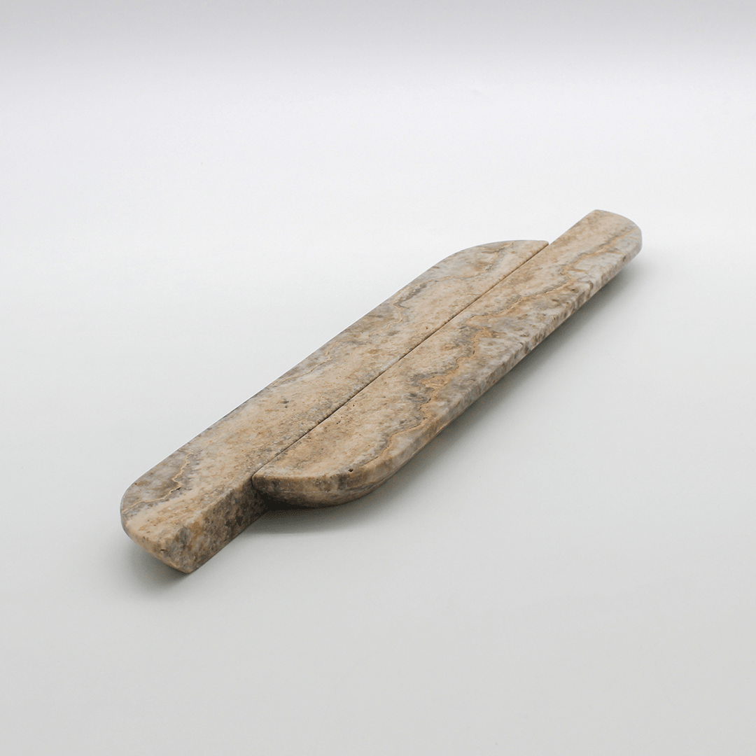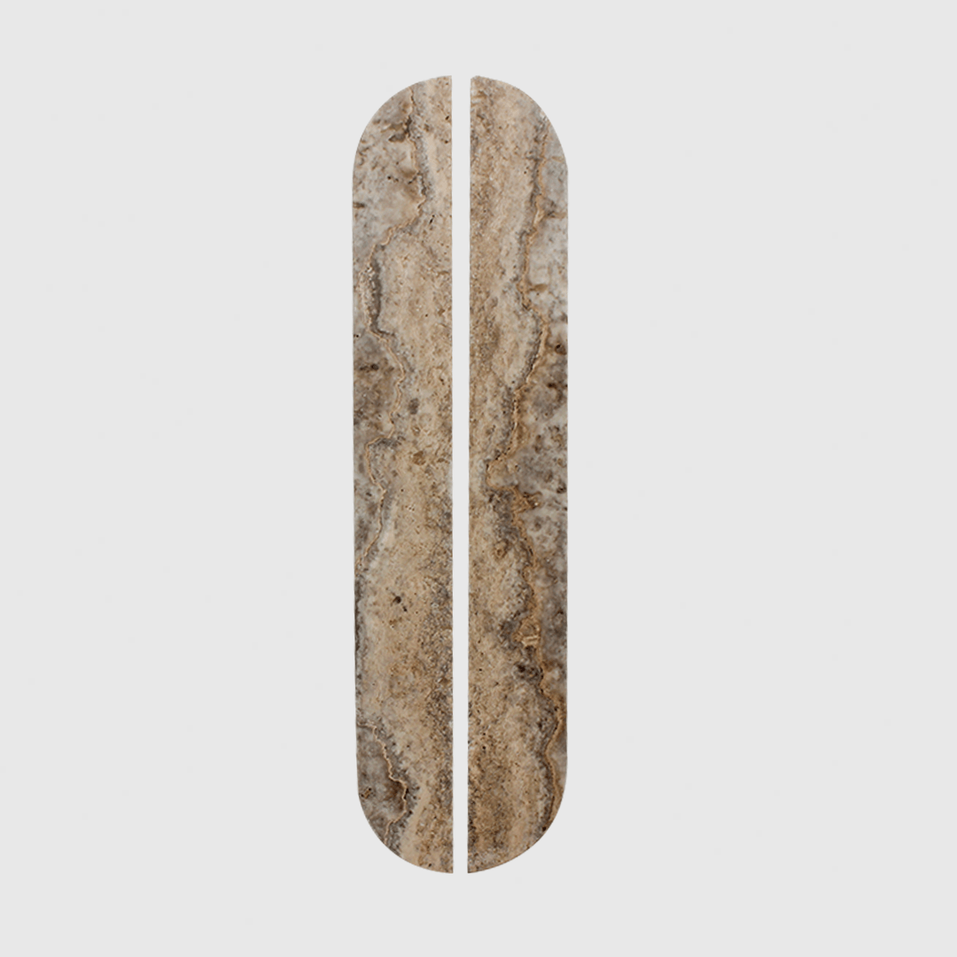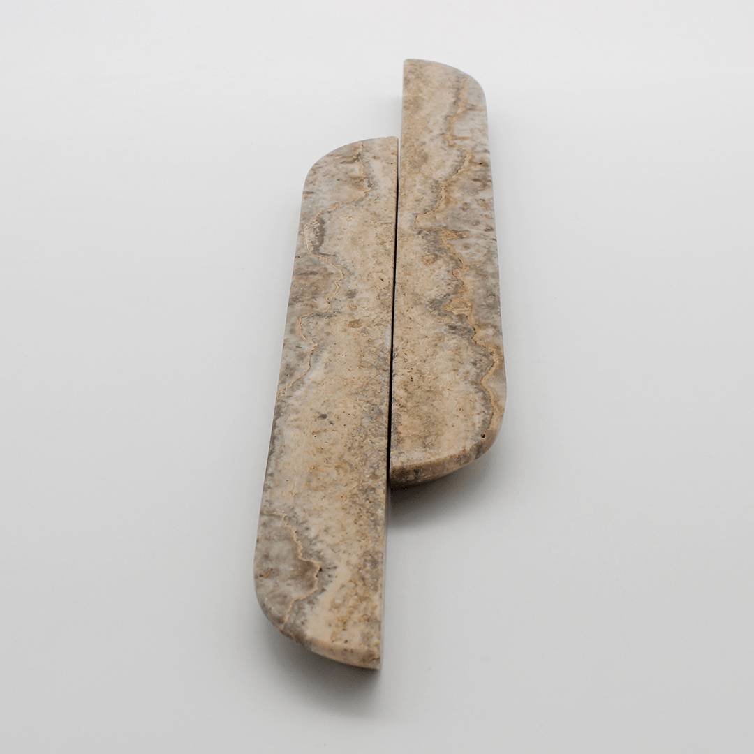 Carved from solid Travertine, this elongated pull offers a beautifully balanced silhouette, sleek, minimal, and perfectly suited to larger drawers, pantry doors, and wardrobe fronts. The calming grey tones and gentle linear veining add subtle depth, while the extended length highlights the natural variation of the stone, turning functional hardware into a statement design feature.