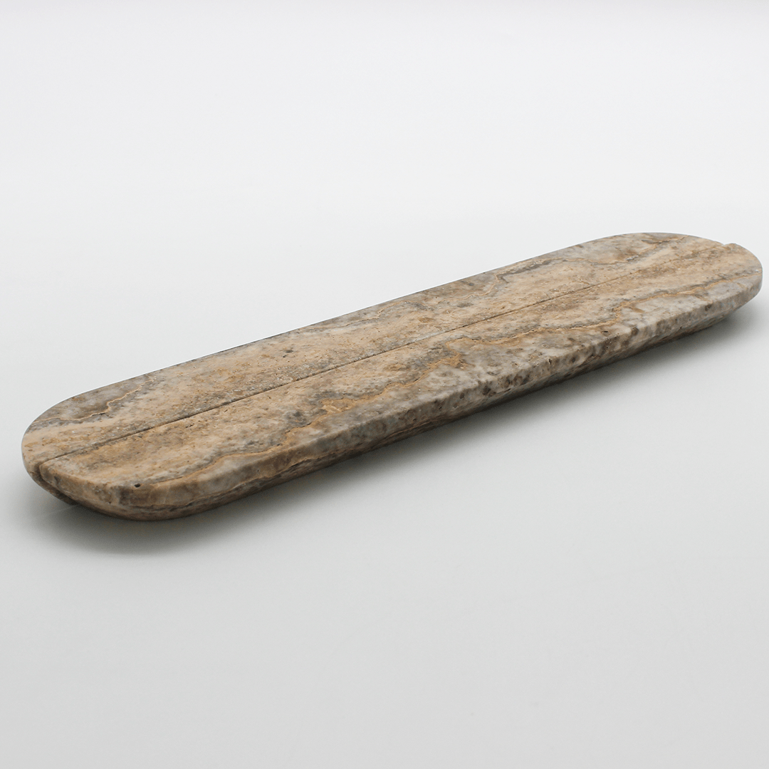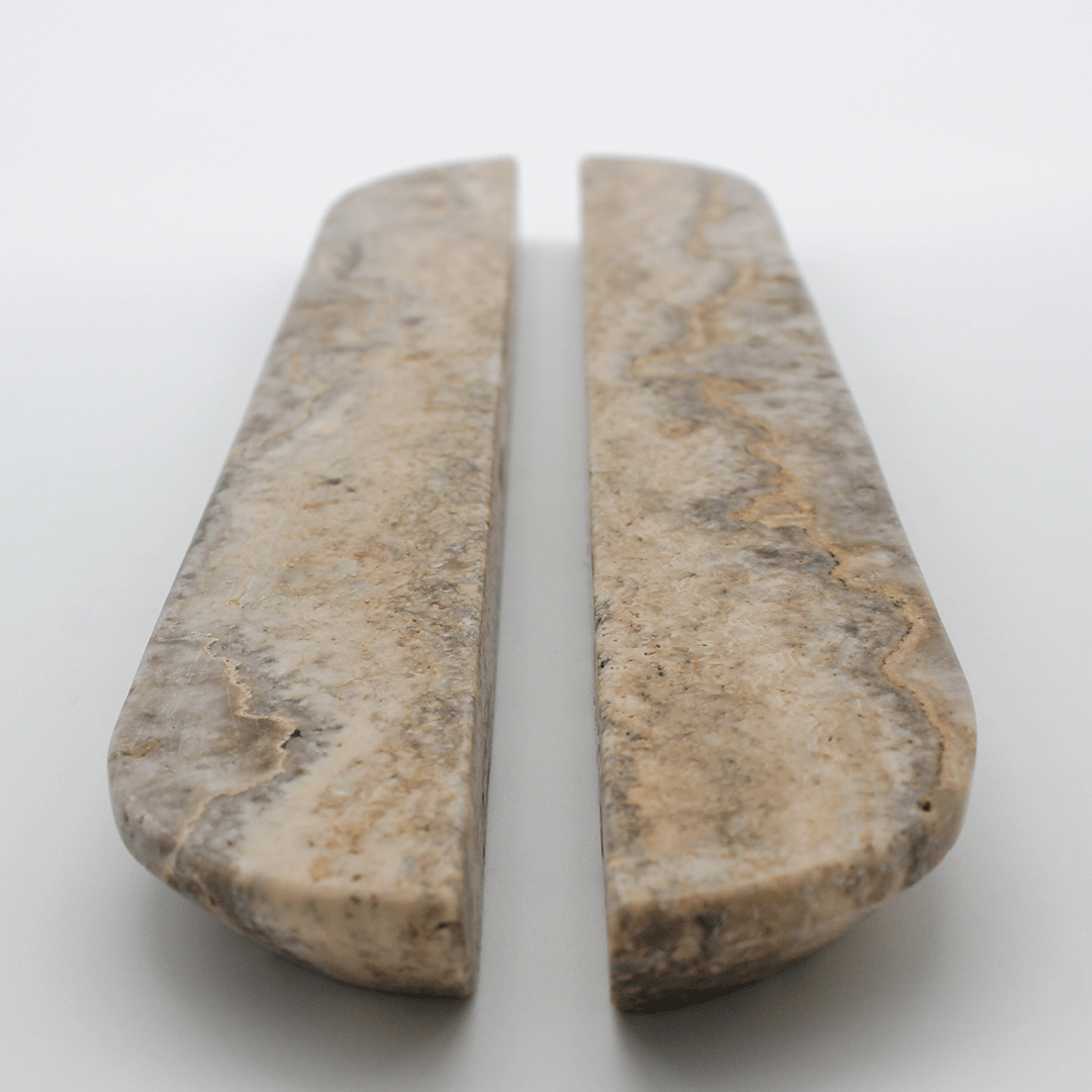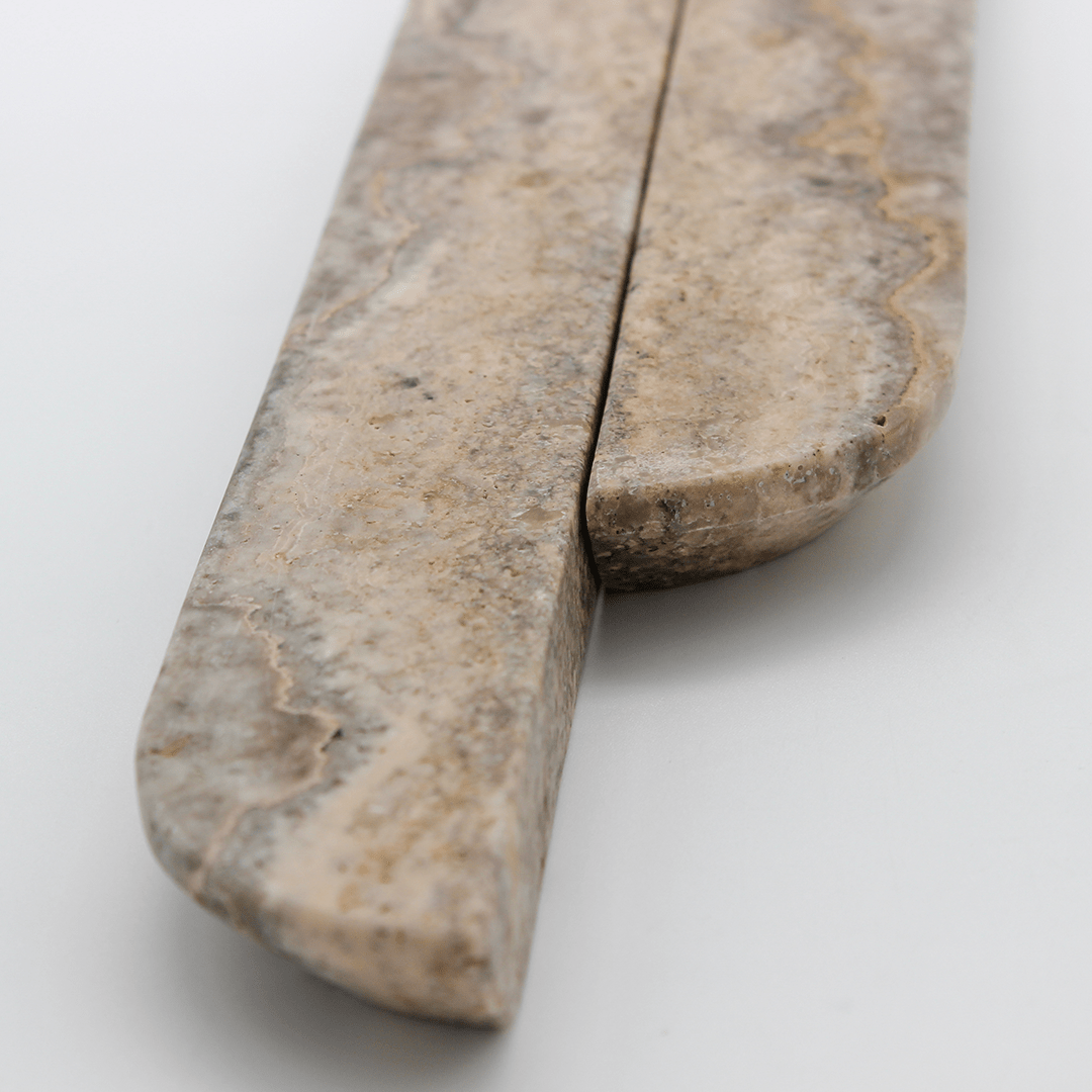 Carved from solid Travertine, this elongated pull offers a beautifully balanced silhouette, sleek, minimal, and perfectly suited to larger drawers, pantry doors, and wardrobe fronts. The calming grey tones and gentle linear veining add subtle depth, while the extended length highlights the natural variation of the stone, turning functional hardware into a statement design feature.