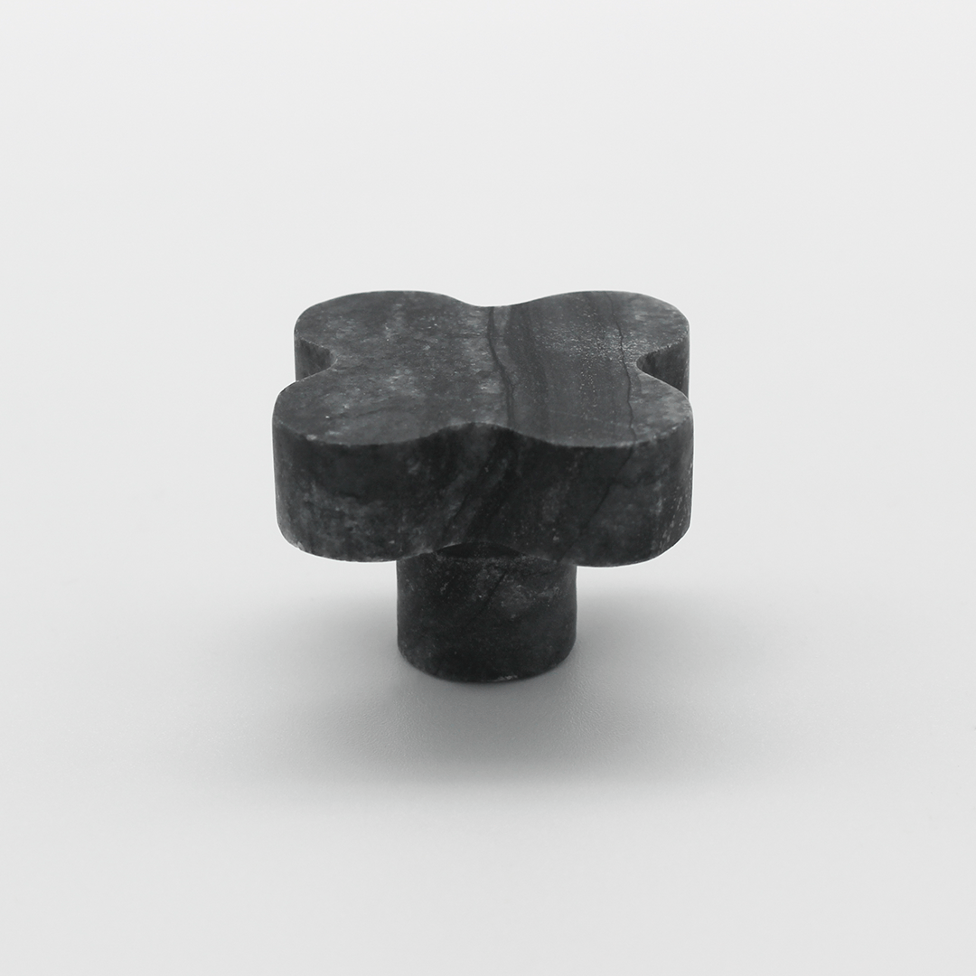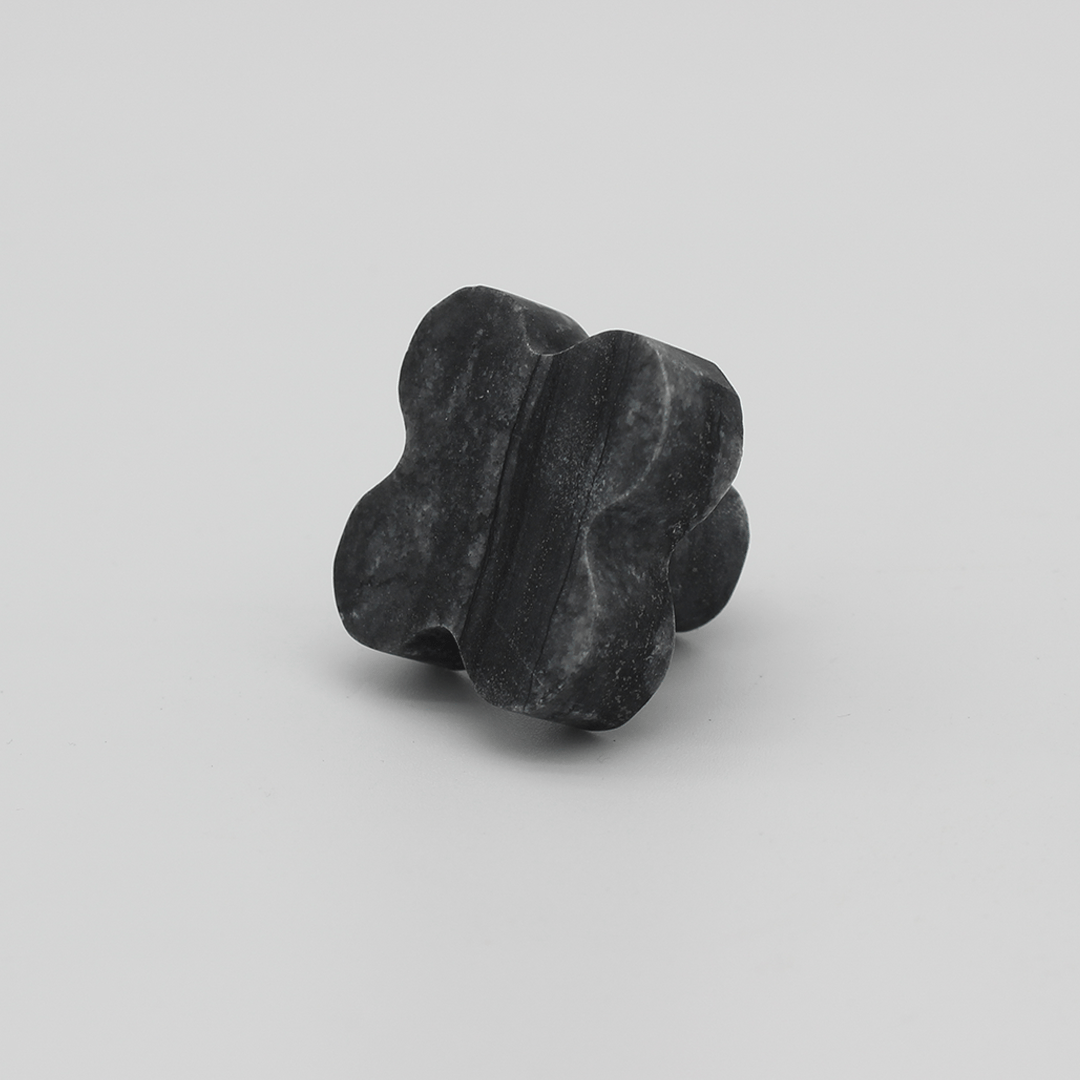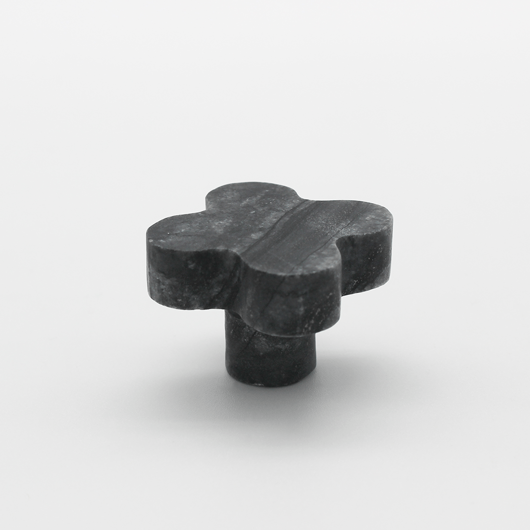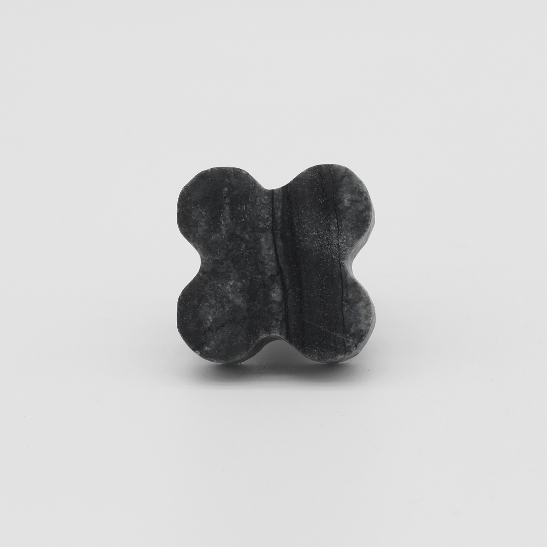 This striking stone showcases flowing grey, charcoal, and silvery veining, creating a bold visual impact. The hand sculpted clover shape enhances the dynamic movement of the marble, offering a luxurious statement for cabinetry. Perfect for feature bathrooms, statement wardrobes, or modern monochrome kitchens.