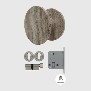 The brushed nickel mortice lock offers a clean and timeless finish, while the silver travertine circular entry pull introduces subtle texture and warmth.