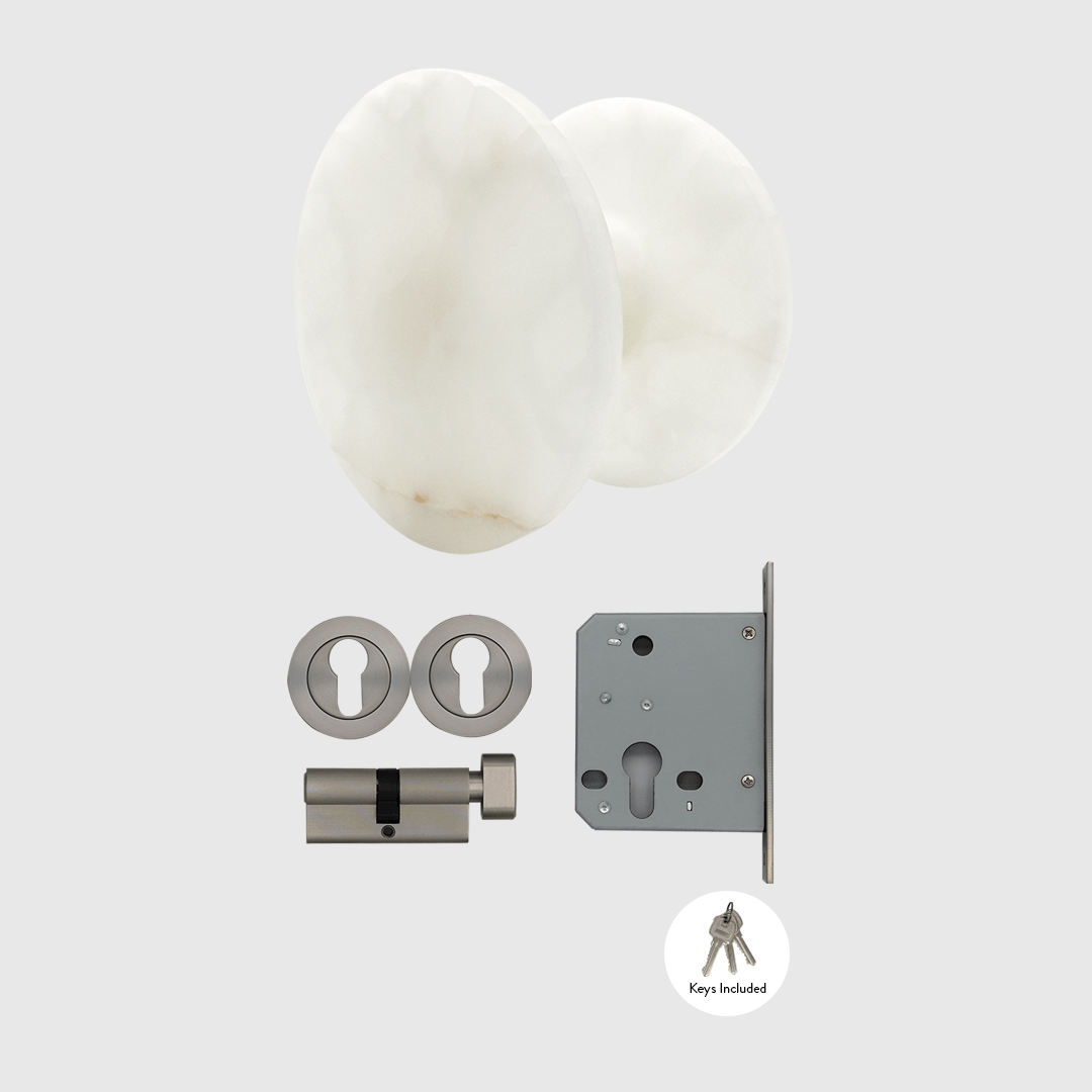 The brushed nickel mortice lock offers a clean architectural look, while the white onyx circular entry pull introduces a subtle, elegant focal point.