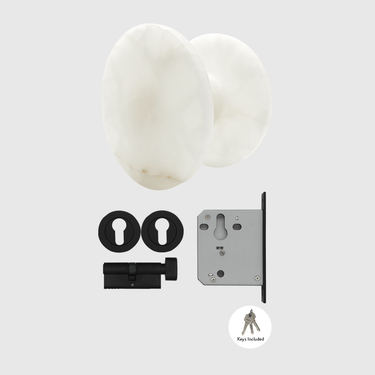 Create a high contrast and refined entrance with our Matte Black & White Onyx Entry Door Hardware Pack. This pairing brings together bold matte black hardware with the soft luminosity of white onyx stone.
