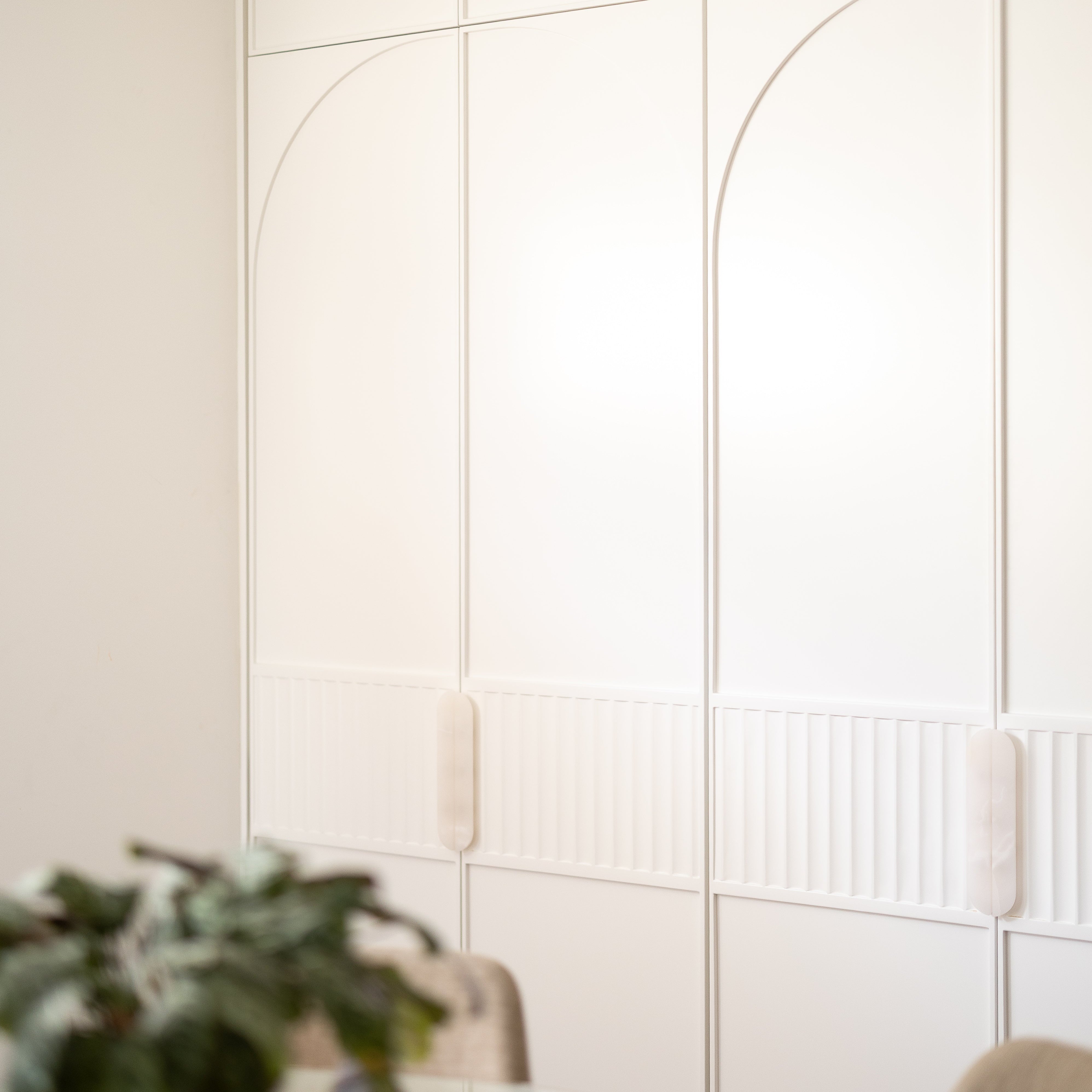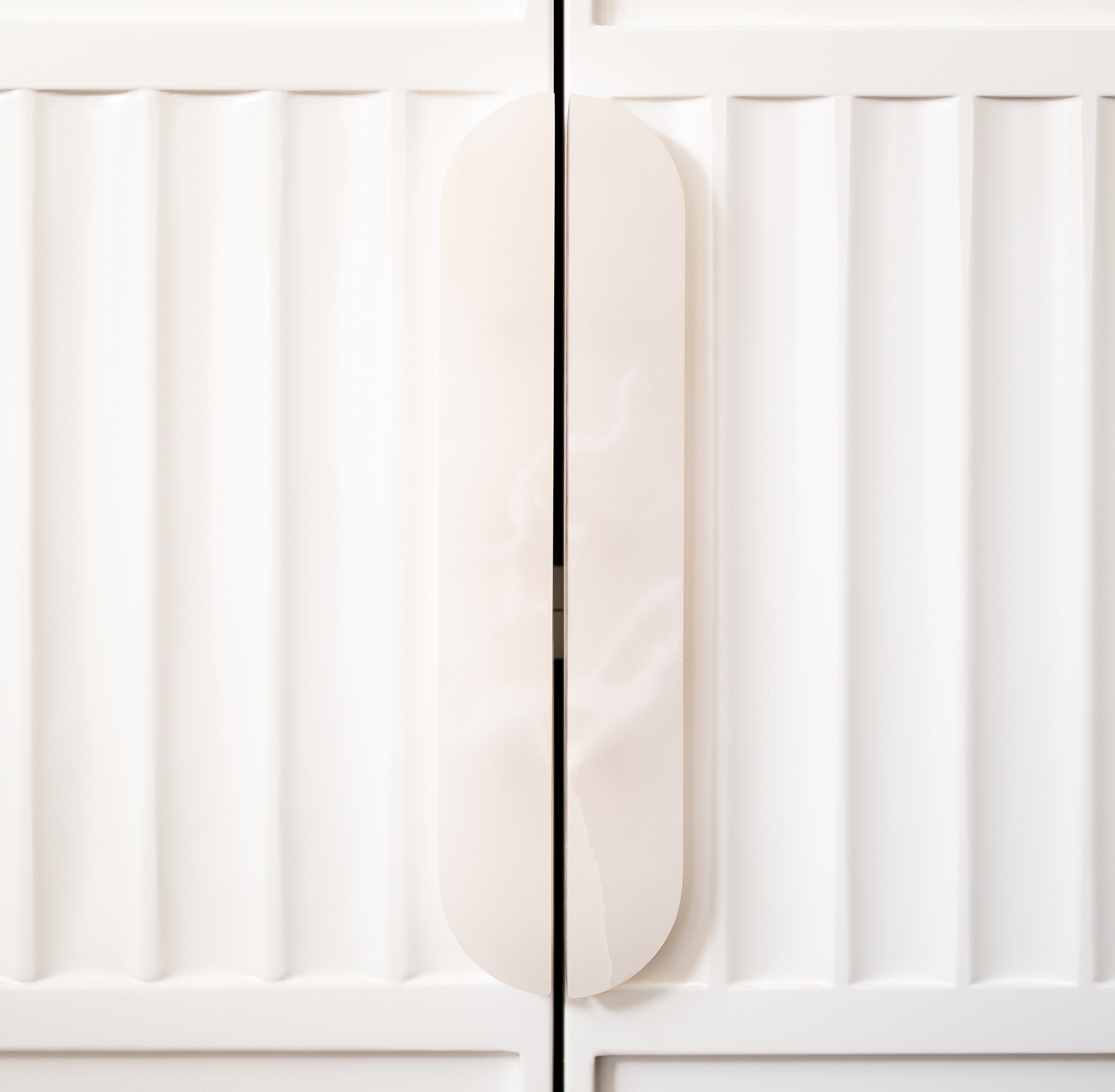 Sophisticated in form and grounded in nature, our 320mm Stone Pull – Elongated Pair is sculpted from premium White Onyx. Designed as a split set, this handle pair forms a seamless vertical line when mounted side-by-side, creating a sculptural focal point on cabinetry. The soft-rounded ends and honed stone texture bring a tactile elegance, while the natural veining ensures each piece is one of a kind. Ideal for wardrobe doors, full-height joinery, or statement cabinetry.